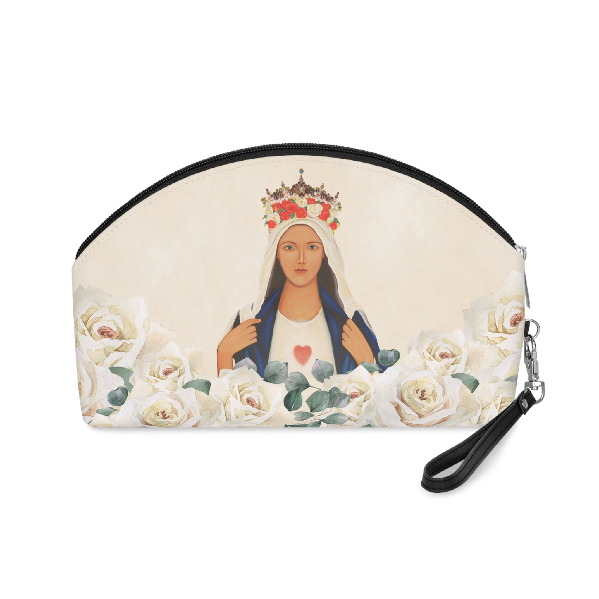There's more to makeup bags than meets the eye. Their main purpose is to store cosmetics, but they're often used to carry travel essentials, like cables, headphones, medicine, hygiene products. Some even use them as art supply cases. These curve-top bags will be the top multi-purpose item in any home with your unique design. They have a zipper for safety and a removable leather strap for comfort.