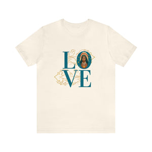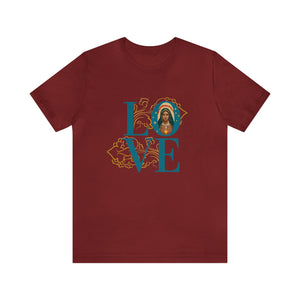 Featuring large "LOVE" message with embedded artist's rendering of Our Lady of Guadalupe.