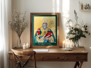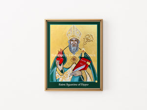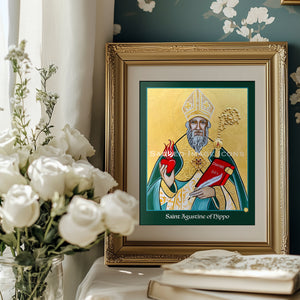Augustine of Hippo is portrayed in his bishop’s vestments, holding a crosier marked with the letter "A" to signify his name and distinguish him from icons of other bishops. In one hand, he carries a writing quill and the book Civitas Dei (The City of God), a cornerstone of Western thought that explores theology, including the suffering of the righteous, the existence of evil, the conflict between free will and divine omniscience, and the doctrine of original sin. In the other hand, a blazing heart reflects his teaching from Proverbs 23:26, 'My son, give me thy heart,' urging devotion over worldly distractions, and his passion to drive heresy from the Church. Framed with rich gold embossing and detailed relief work, this icon celebrates and explains his enduring influence as a Church Father.