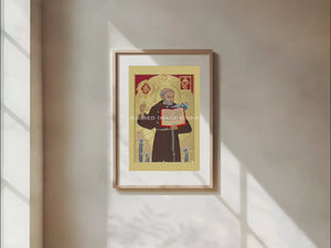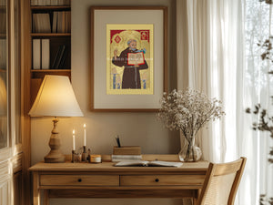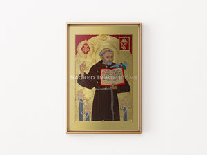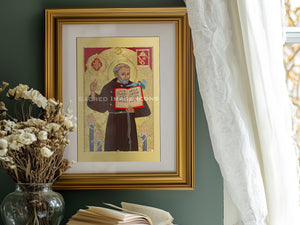 Saint Bernardine of Siena is depicted in his simple Franciscan habit against a gold leaf background, holding a book with the Latin phrase "quae sursum sunt sapite, non quae super terram" ("Set your minds on things above, not on earthly things"), emphasizing his spiritual focus. A coat of arms in the top right, featuring the "IHS" Christogram within a sunburst—his signature devotion to the Holy Name—also includes an arrowhead for the San Bernardino Valley and a Raincross for Riverside, reflecting the diocese’s heritage. Three bishop miters at his feet represent the dioceses—Siena, Ferrara, and Urbino—he declined in favor of preaching. Framed with rich gold embossing and detailed relief work, this icon honors his 15th-century role as a dedicated evangelist.