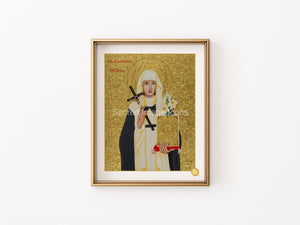 In this icon, Saint Catherine is shown holding the crucifix in her right hand and the scriptures in her left. Also in her left hand are three lilies, symbols of purity. In her halo is imprinted the image of the crown of thorns, symbolizing a vision she had five years before her death in which Christ offered her a golden crown, symbolizing earthly riches, or a crown of thorns, symbolizing the glory of heaven through suffering in this life.