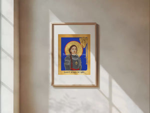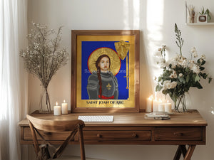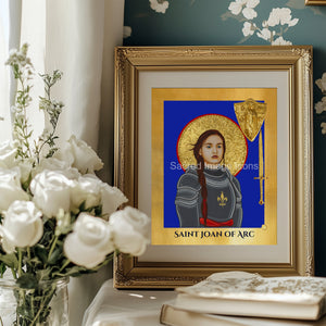 In this variation, Joan is shown standing confidently gazing at the horizon, dressed in armor with a red ribbon tied around her waist, symbolizing her death as a martyr. A golden sword and a shield emblazoned with the Blessed Virgin Mary adorns the top right corner, finished with the Fleur-de-lis, which is the symbol of French royalty’s divine right to rule. St. Joan of Arc is also the patron saint of Sacred Image Icons.