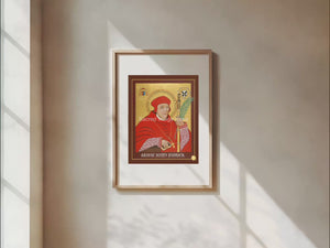 In this icon, St. John Fisher is dressed in the red of a cardinal. He holds in his hand the crosier of a bishop and a palm symbolizing eternal life. His halo is rimmed with red to show that he died a martyr for the Church.