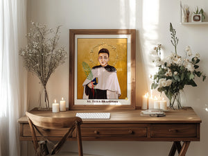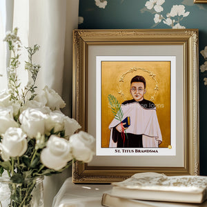 Known as an academic and fiercely outspoken opponent to the Nazi regime, Carmelite Saint Titus stands holding a book, an palm branch representing his pursuit of peace, and a red ribbon representing his martyrdom. A keen observer will notice his halo constructed of gold-relief barbed-wire, representing his incarceration and torture in concentration camps, ultimately leading to his martyrdom by lethal injection in 1942.