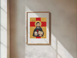 In this icon, Saint Camillus is shown in the habit of the order. Behind him is the large red cross which is on the habits of the order and has become a symbol for all health care workers. He holds a skull, which is often shown in Church art as a memonto mori, a reminder of the inevitability of death.