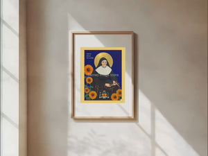 In this icon she is shown with the sunflowers mentioned in her prayer, and with the coat of the Sister of Notre Dame.
