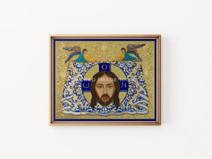 The icon of the Holy Face of Christ is rich in symbolism. Central to the image is the face of Jesus Christ, imprinted on a cloth held by two angels, patterned with intricate designs, representing the Veil of Veronica, which according to tradition, bore the image of Jesus' face after a woman wiped His face during the Stations of the Cross. This act of compassion is a symbol of faith and devotion in the face of suffering. All this is set against a beautifully ornate golden backdrop.