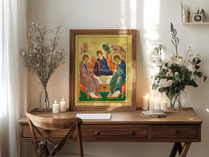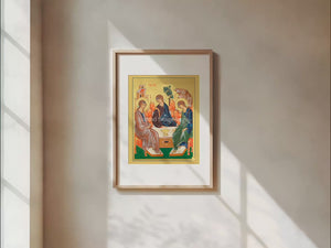 This icon takes as its subject the mysterious story where Abraham receives three visitors as he camps by the oak