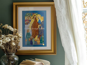 Jesus and Mary are pictured at the Wedding at Cana. In the background, the newly-married couple sit holding an empty cup, while Jesus tells the server to pour water into wine jugs. His hand is outstretched over the already full jugs. Mary looks on from over Christ’s shoulder.