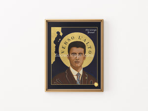 In this image, Blessed Pier Giorgio is shown with the motto Verso L’Alto: To the top! In the background is the silhouette of him climbing a rock face as he so often did in his mountaineering. AMDG!