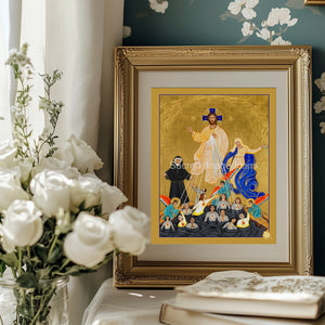 This icon was originally commissioned by Susan Tassone, sometimes called “the purgatory lady” because she has written multiple books on the subject. It appeared on the cover of her book The St. Faustina Prayer Book for the Holy Souls, and it now resides at the National Shrine of The Divine Mercy in Stockbridge, Massachusetts.