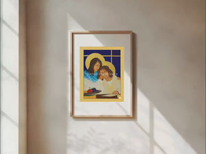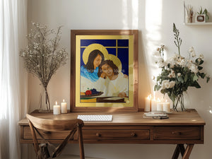 In this icon, it would be important to present the image of a teenaged Jesus, not a child, but not an adult. He is sitting at a table with books and paper around, around sixteen years of age and approaching physical maturity, clearly doing some studying into the evening, perhaps preoccupied and a bit weary. Behind him, over his shoulder is the Blessed Mother. Once again, we would present her differently from the usual way she appears, not as a youthful bride or mother of a baby, but as a middle aged woman, with grey in her hair and wrinkles, somewhat weary herself, but weary from a life of hard work rather than weary from the stress of studies. She is bringing something to her Son that shows her care, a snack, and her hand rests lightly on his shoulder with motherly concern and support.I would envision this presentation being somewhat timeless. That is, Jesus is wearing a white garment which could suggest a tee shirt in our world or a tunic in his. A sleeveless garment is over that—perhaps a earth-toned Patagonia fleece in our world, but just something added for warmth in the time of Christ. His mother is wearing something also white, which could be the typical garment of their day but also a loose blouse or nightdress in our world, with something blue over that. She is not veiled, but both mother and son have their gold halos in accord with the iconographic tradition. The snack itself could be something like fruit and cheese which could be eaten in Palestine or Philadelphia. The icon would be heavy on blues, golds, and whites, appropriate colors for Mary and also for our school.