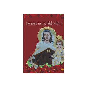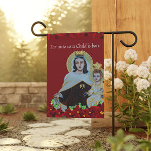 "For unto us a Child is born" A beautiful reminder of the true meaning of Christmas. Help anyone transform their homestead or garden with a simple addition - the personalized banner. Made with lightweight yet highly durable poly poplin-canvas fabric, these banners feel premium to the touch and will oversee your home for years on end. This image is exclusive to Sacred Image Icons. AMDG