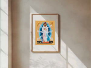 The traditional Divine Mercy image is based on a painting made by St. Faustina after a series of visions sent to her by Christ in which He encouraged devotion to His Divine Mercy. The Divine Mercy is traditionally portrayed in a more Western style.