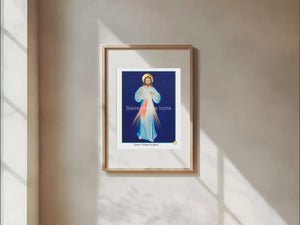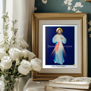 At the bottom appears the phrase "Jesus I Trust In You", which St. Faustina was instructed by Christ to include in her image of the Divine Mercy. Christ is shown with the red and blue beams of light symbolizing the blood and water that flowed out of his side when it was pierced by a Roman soldier's lance on the cross.