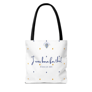 Answer your calling with courage and conviction. This bold tote bag features our most popular icon design: St. Joan of Arc standing resolute with her banner held high, a timeless symbol of faith, bravery, and unwavering purpose. The playful "Joan up!" on the front invites you to embrace her warrior spirit, while "I was born for this!" on the back echoes her fearless declaration of divine mission.