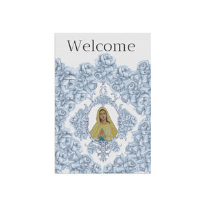 Help anyone transform their homestead or garden with a simple addition - a garden flag of Our Lady of Lourdes Perfect for every Catholic home.  Made with lightweight yet highly durable poly poplin-canvas fabric, these banners feel premium to the touch and will oversee your home for years on end. This image is exclusive to Sacred Image Icons. AMDG!