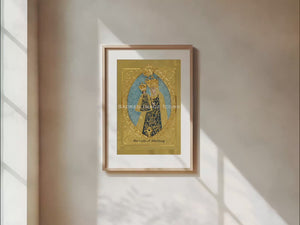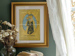 Contemplate the regal presence of Our Lady of Altötting, her dark blue mantle adorned with golden floral embroidery, holding the Christ Child beneath crowns encrusted with pearls and turquoise jewels that gleam with divine elegance. A jewel adorns the cross at her base, enhancing the rich gold embossing and intricate relief work that frame the icon, crowned with a floral crest. Set against a tranquil blue background, this sacred image reflects its origins as a 14th-century statue in Altötting, Bavaria, where it became a center of pilgrimage after numerous miracles, earning the title "Heart of Bavaria" and a symbol of hope for centuries.