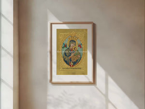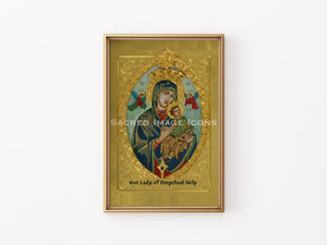 Experience the sacred grace of Our Lady of Perpetual Help, a revered icon whose origins trace back to the 13th or 14th century in the Eastern Mediterranean. Her regal figure, adorned in a deep blue mantle with golden accents, cradles the Christ Child in tender devotion, while her crown and gold crucifix gleam with blue jewels. Rich gold embossing and intricate relief work frame the scene, crowned with a starburst ornament, reflecting its ancient Byzantine heritage. Flanking her are the Archangels Michael and Raphael, their names inscribed in traditional Greek letters above, alongside the holy abbreviations for "Mother of Christ" and "Jesus Christ." Brought to Rome in the 15th century and promoted by the Redemptorist Fathers in 1866, this icon has become a global symbol of intercession and hope, radiating divine aid through its timeless beauty.