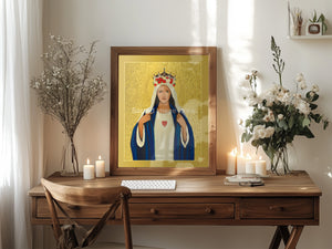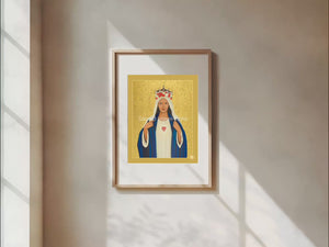 On the original icon, the jewels on the crown were sent in by the women of Heart of Mary, the women’s group that commissioned the image. Decorating icons with real jewels is very traditional in the Eastern Church. Famous icons such as Our Lady of Częstochowa are embellished with many jewels which have been donated by members of the faithful as offerings to the Church.