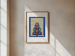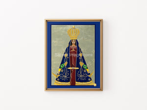 In this icon, Our Lady of Aparecida is shown in her traditional blue robe and crown, decorated with stones, and emblazoned with the flags of Brazil and the Vatican. Brazil has the largest Catholic population of any country in the world, with more than 175 million Catholics as of 2020.
