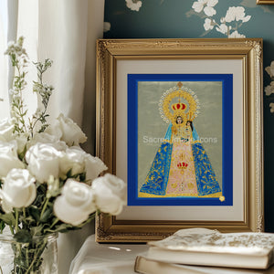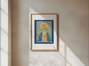 This image is one of a group of eight commissioned for the Duke University Newman Center. The priest sponsoring this project wanted to feature the Marian apparitions which were most important to students from different countries around the world. Students from many countries were interviewed to select these eight apparitions of Our Lady. Together, the display is called Our Lady of The World, and the many ways that Our Lady has appeared to us remind us of her universal motherhood to all believers.