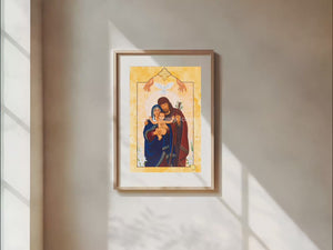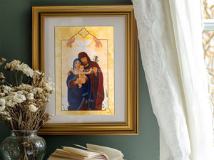 In this sacred image the Holy Family is portrayed in a Western artistic style. St. Joseph is shown with his staff breaking into flower. This is based on a pious legend that St. Joseph was selected as the spouse of Mary by his staff blossoming into flower. In the background, we also see lilies, which are a symbol of purity.