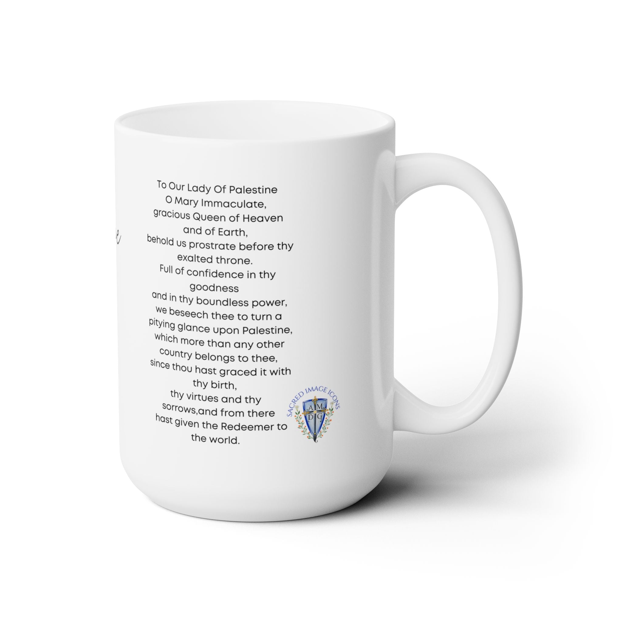 To Our Lady Of Palestine, O Mary Immaculate,gracious Queen of Heaven and of Earth, behold us prostrate before thy exalted throne. Full of confidence in thy goodness and in thy boundless power, we beseech thee to turn a pitying glance upon Palestine, which more than any other country belongs to thee, since thou hast graced it with thy birth, thy virtues and thy sorrows,and from there hast given the Redeemer to the world.