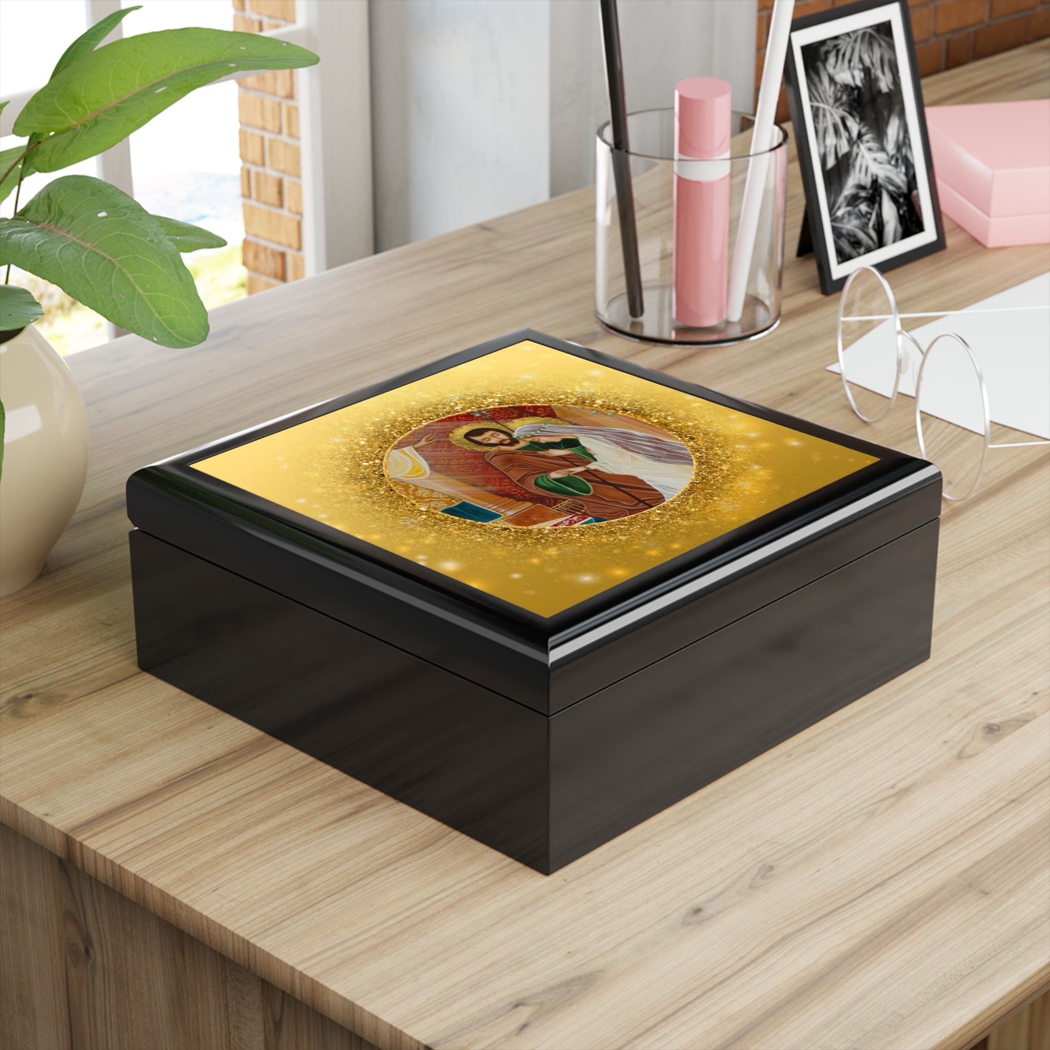 Elegant Gold Wedding Box with The Wedding of Jospeh and Mary for your wedding rings or Rosaries. Perfect for weddings, Christmas, anniversaries, and special occasions. Relevant to individuals looking for a beautiful storage solution for their precious jewelry pieces or rosary.