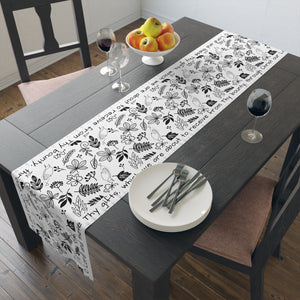 Bless us, O Lord - Catholic dinner prayer table runner. Transform your dining experience with this beautifully designed Table Runner. Crafted to elevate any table setting, it brings a warm and inviting atmosphere to gatherings, making it perfect for both casual family dinners and festive celebrations. The delicate floral prints and thoughtful messages create a serene and pleasant vibe, ideal for holidays such as Thanksgiving and Christmas, as well as everyday use. Whether you're an avid entertainer or simply looking to enrich your home decor, this table runner is relevant for anyone who values aesthetic charm and comfort in their living space. It's a beautiful addition for those who appreciate nature-inspired designs and want to create memorable moments with loved ones.