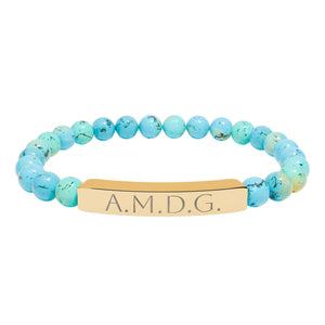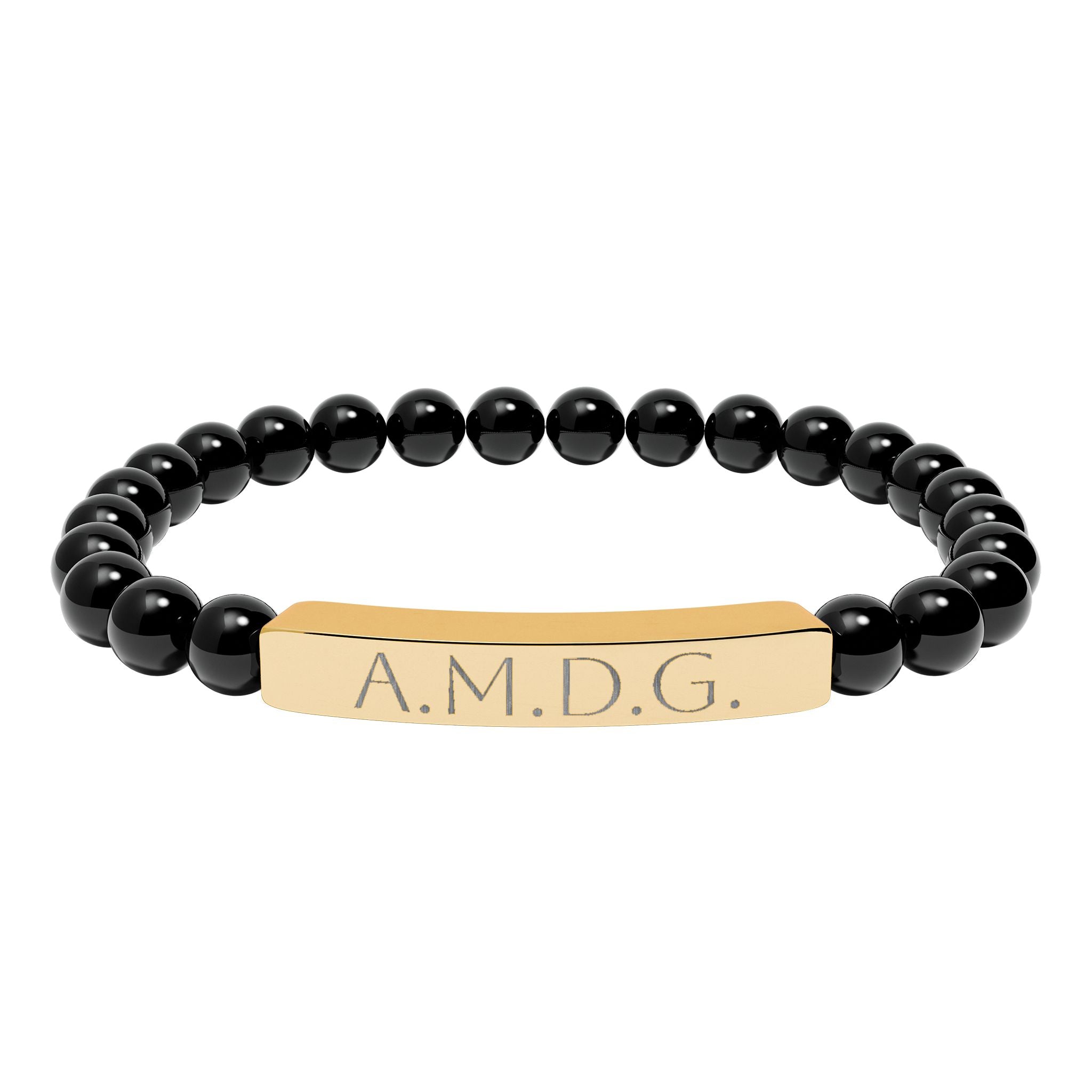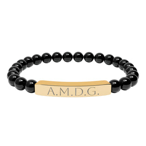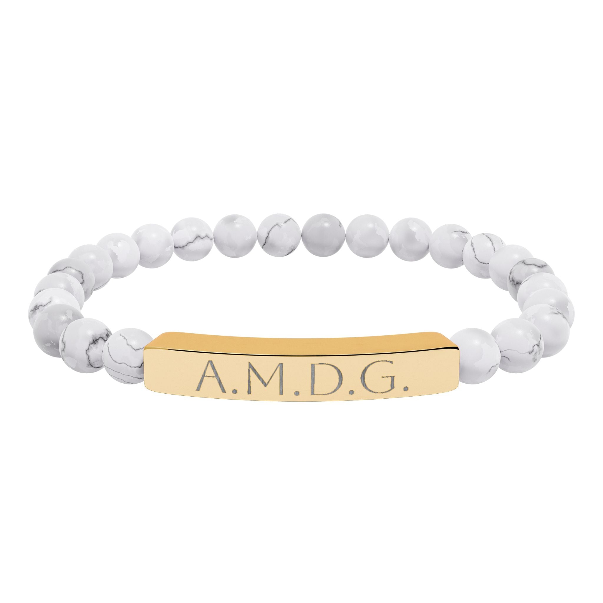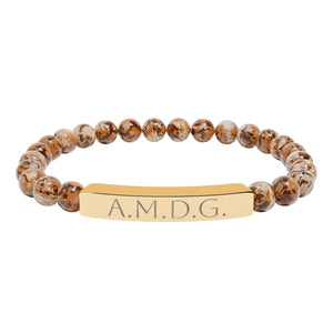 Elegant Natural Stone Bar Bracelet with engraved Latin phrase 'Ad majorem Dei Gloriam' meaning 'to the greater glory of God'. The bracelet exudes sophistication and spiritual elegance, making it a perfect accessory for those seeking to add a touch of meaning to their outfit. Ideal for individuals looking for a stylish yet meaningful piece of jewelry that reflects their faith and devotion. Perfect for religious holidays, occasions, or as a thoughtful gift for spiritual friends and family members.
