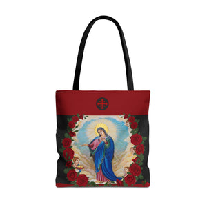 This distinctive tote bag features Our Lady of Palestine surrounded by luminous roses against a dramatic black backdrop, with the logo of the Equestrian Order of the Holy Sepulchre of Jerusalem at the top. The design celebrates both Marian devotion and the sacred mission of supporting the Christian presence in the Holy Land.
